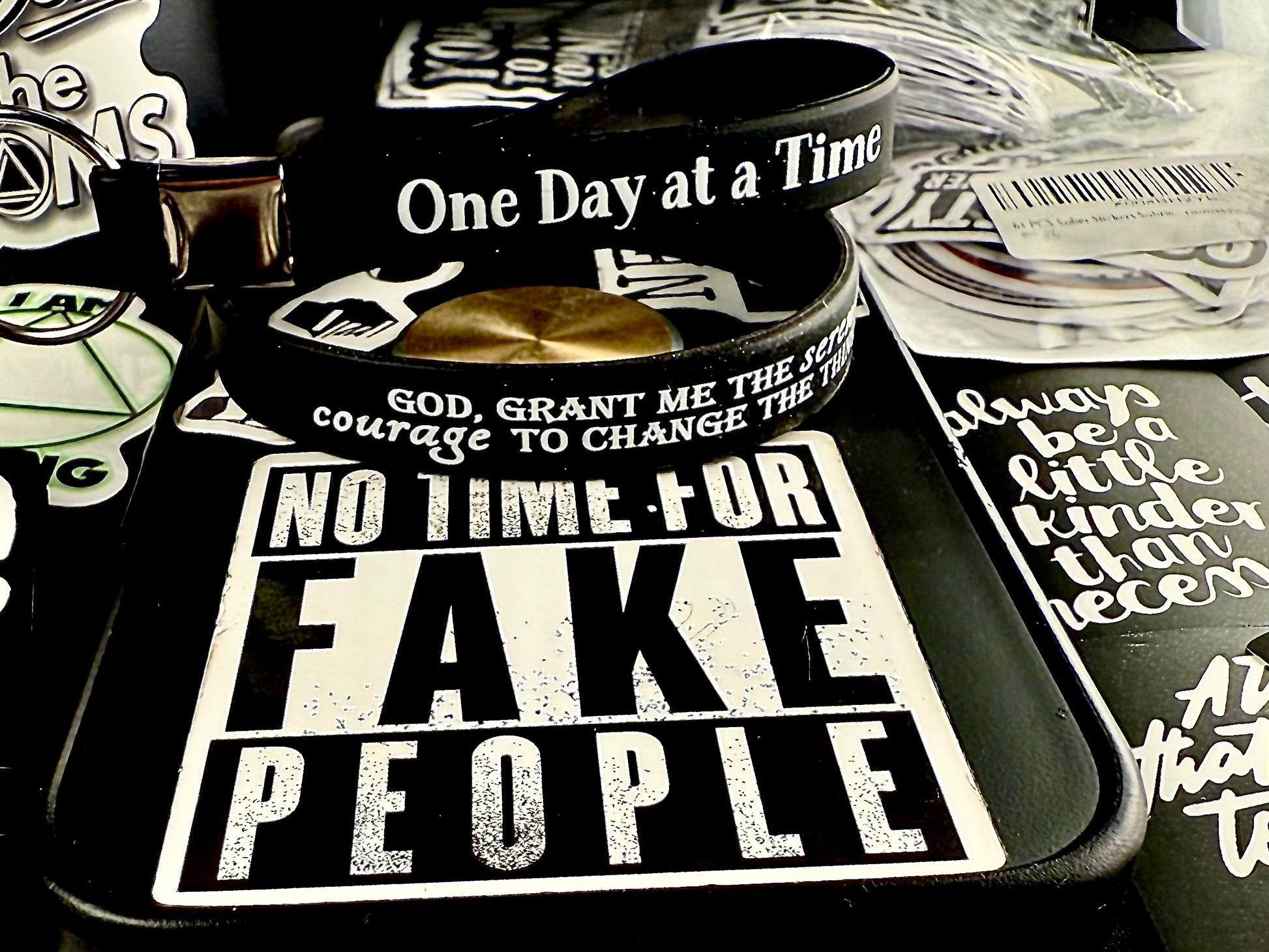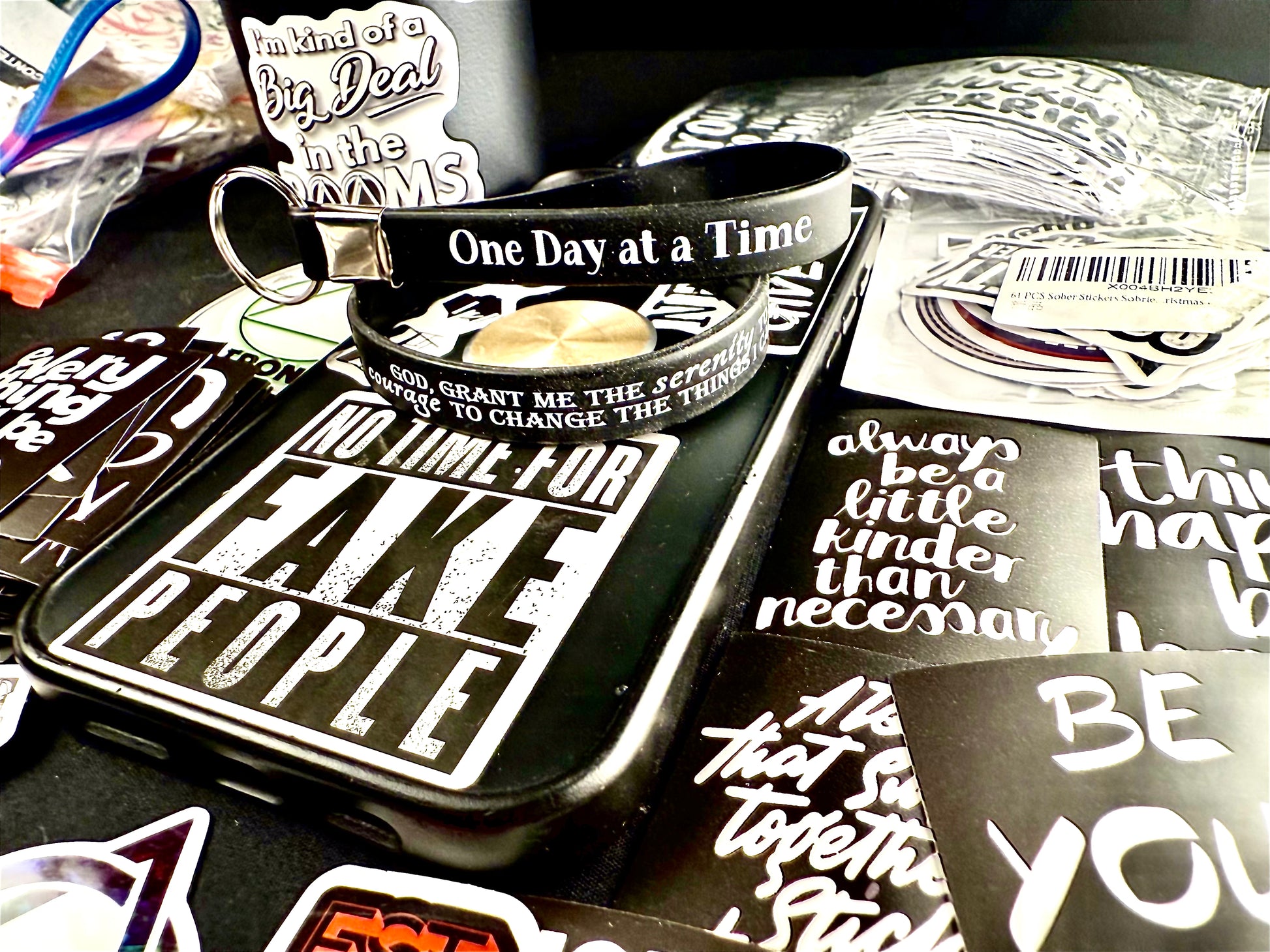 Stay inspired every day with the Blacked Out Serenity Prayer Band & One Day At A Time Keychain set. Designed for those on a recovery journey, this 8" Wrist Circumference wristband and durable keychain serve as constant reminders of strength and perseverance. The set includes 10 motivational stickers, perfect for personalizing your phone, water jug, or laptop with empoweringย messages. Embrace positivity and stay focused on your path with accessories that blend style and meaningful support.