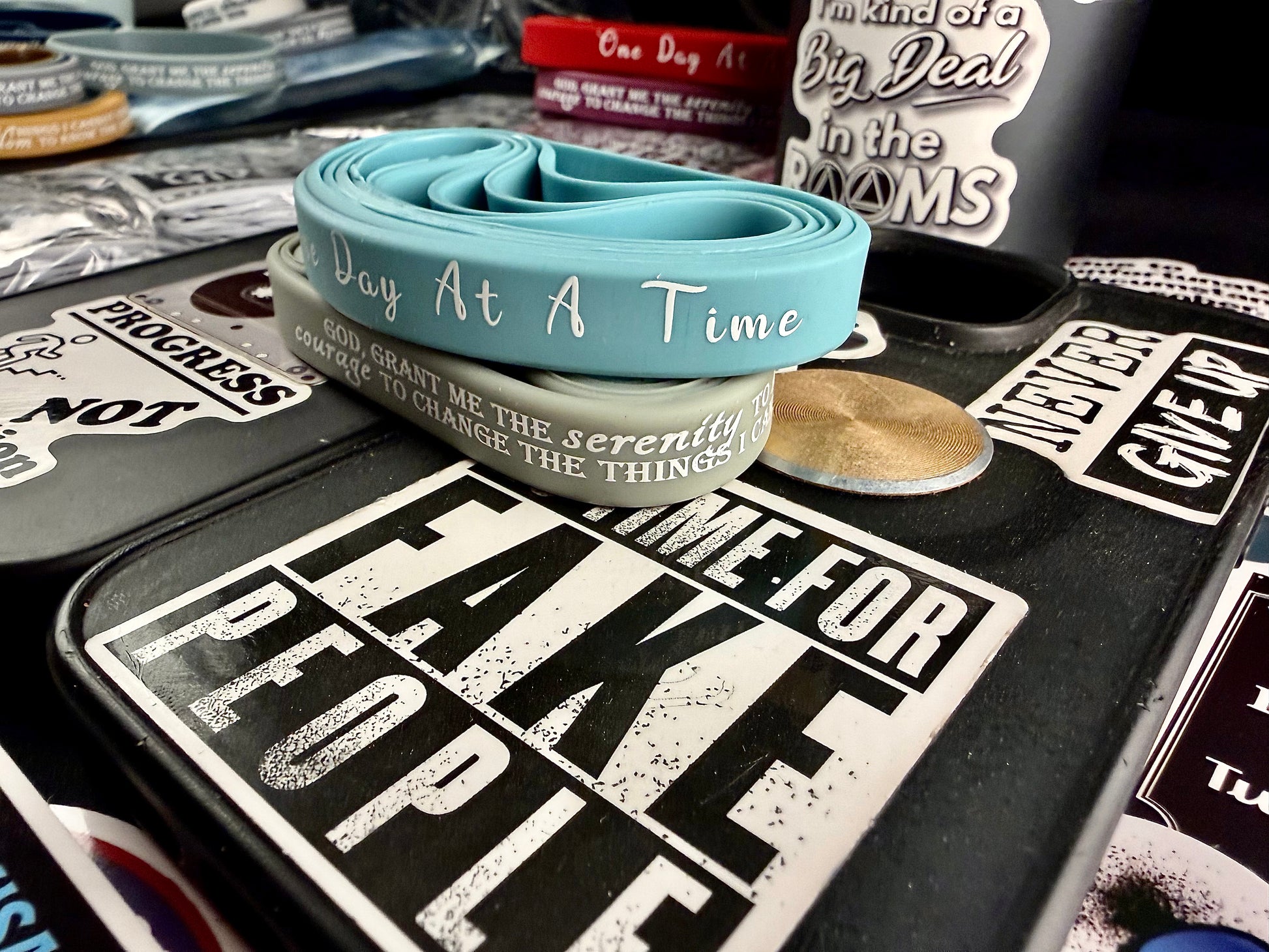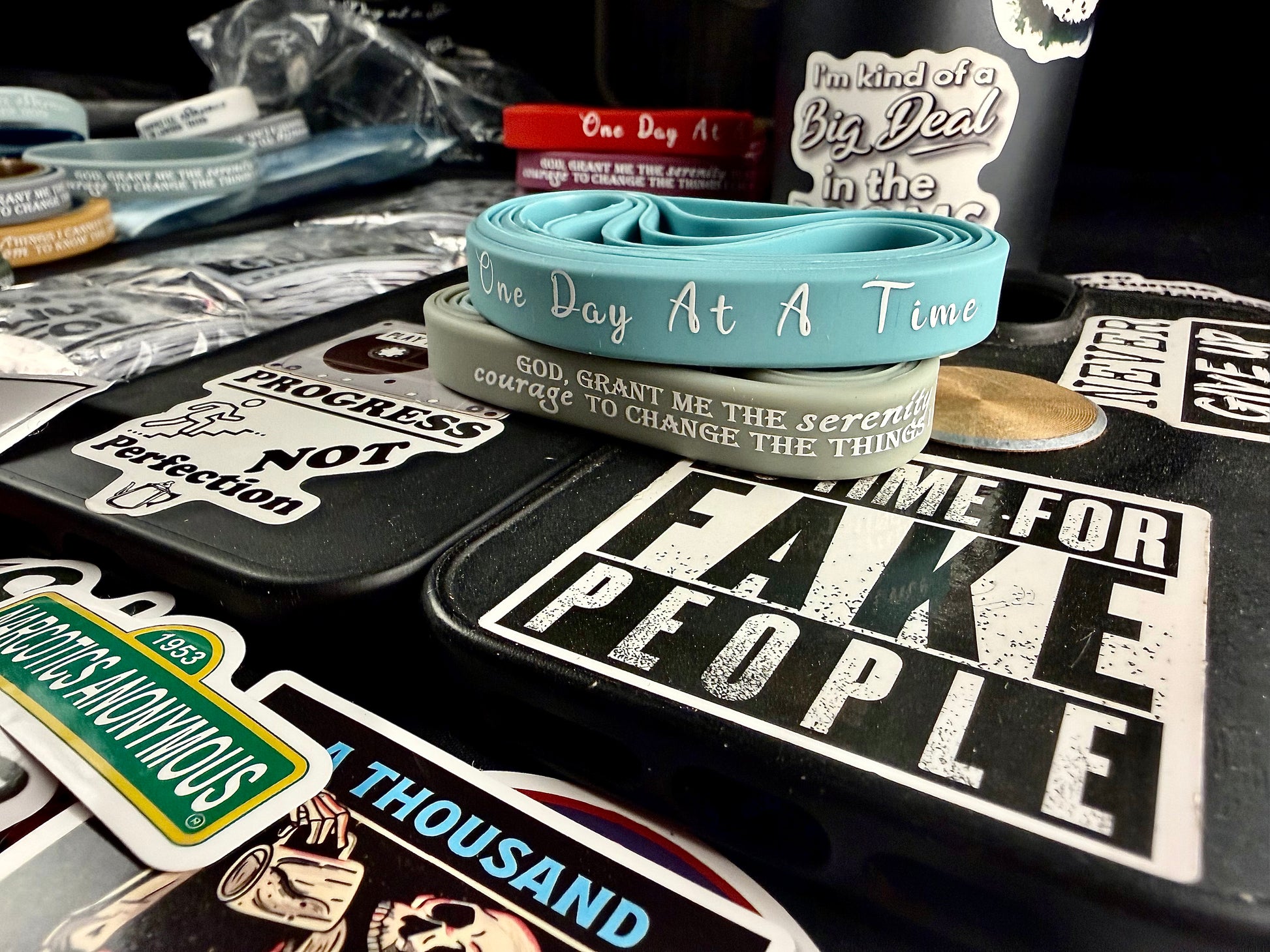 Nature & Cky Meets One Day Serenity Bandsππ»ππ Embrace your recovery journey with this powerful combo pack featuring sleek black wrist bands designed for men with an 8" Wrist circumference. Each set includes 10 inspiring recovery and motivational stick-ons for Ur Phone, Water Jug, Laptop Ext to personalize your bands with daily affirmations and spiritual reminders. Perfect for staying grounded during challenging moments, these bands serve as tangible symbols of your commitment to sobriety and inner peace. Whether you're one day sober or celebrating years of progress, wear your strength with pride and let these meaningful accessories inspire both you and those around you. Colors May Appear Slight Different, Includes 1 One Day & 1 Serenity Band W/10 Recovery Inspirational Stick-ons