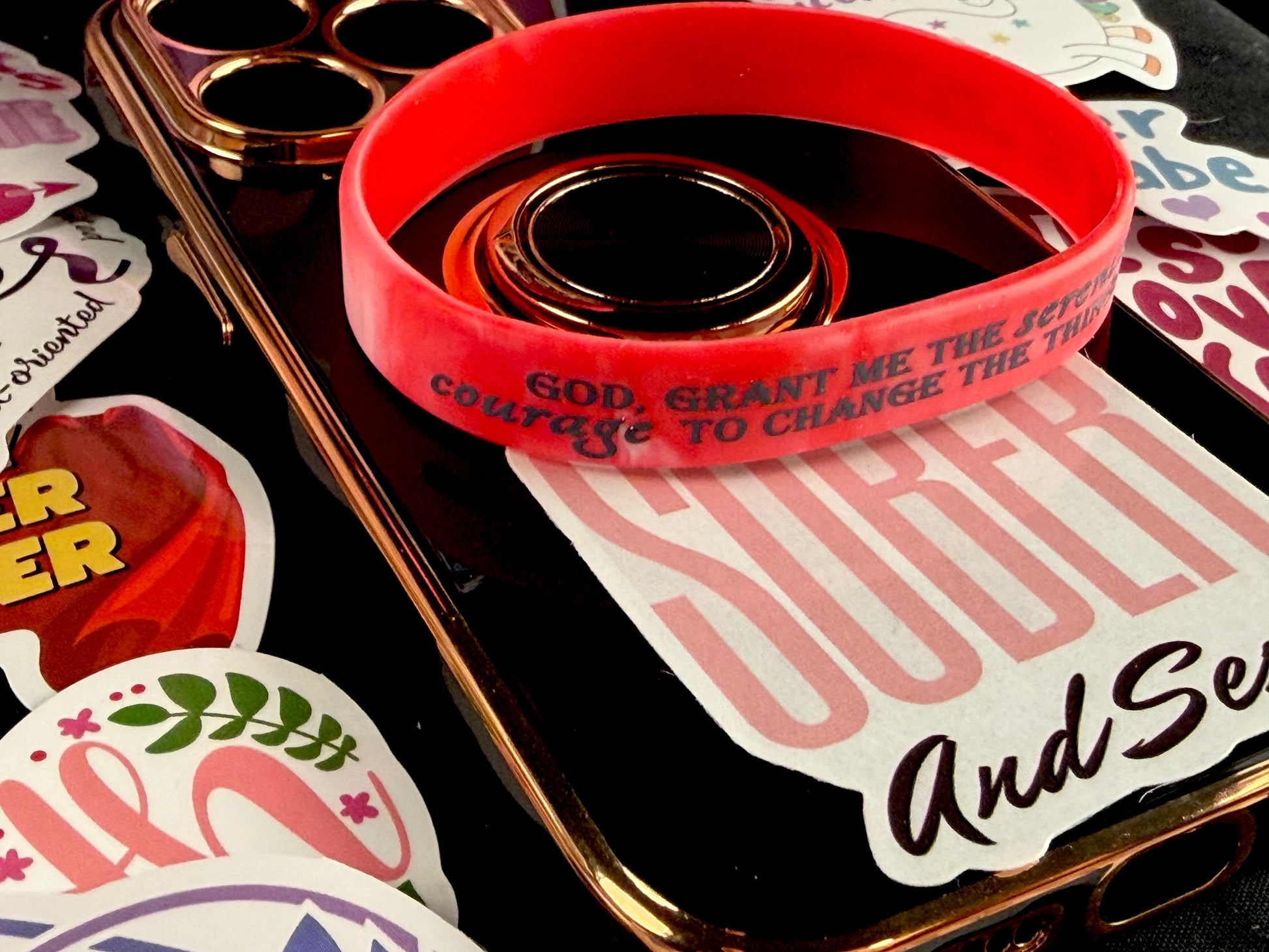 Her Twisted Heartz Red Serenity Band combines wearable wellness with personalized inspiration. This vibrant band fits a 7.5" wristย and serves as a tangible reminder of your strength and inner peace during recovery or personal growth. The package includes 10 recovery-focused stick-ons featuring uplifting messages and designsโperfect for customizing your phone, water bottle, laptop, and beyond. Transform everyday items into powerful affirmations that reinforce your wellness commitment and celebrate every step forward on your journey toward a better you.